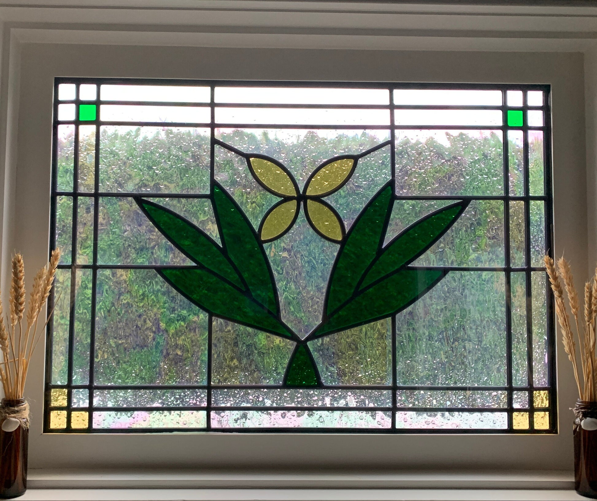 This beautiful window is made with clear glass, amber, dark green and a touch of grass green. Measures 18x25 1/2. Ready to install or let me know if you need hooks to hang.