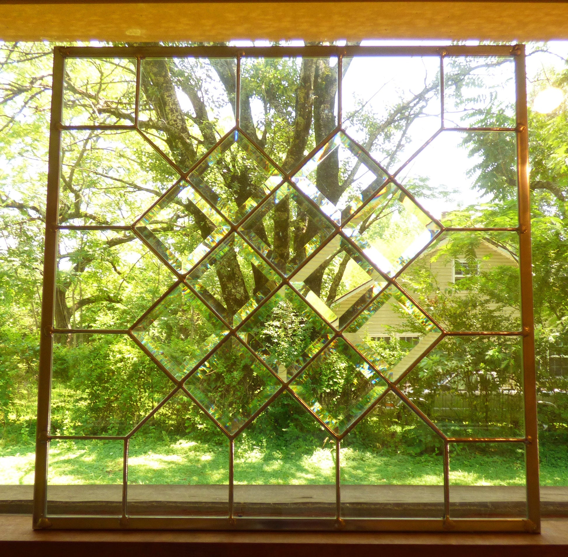 WE MAKE CUSTOM SIZES! Quilt style stained glass panel with 12 diamonds and clear outer border. Perfect for Window, Sidelight, Transom or Suncatcher. Brighten up your front door entrance or add privacy. Measures 20x20". Hooks can be added for a beautiful suncatcher.