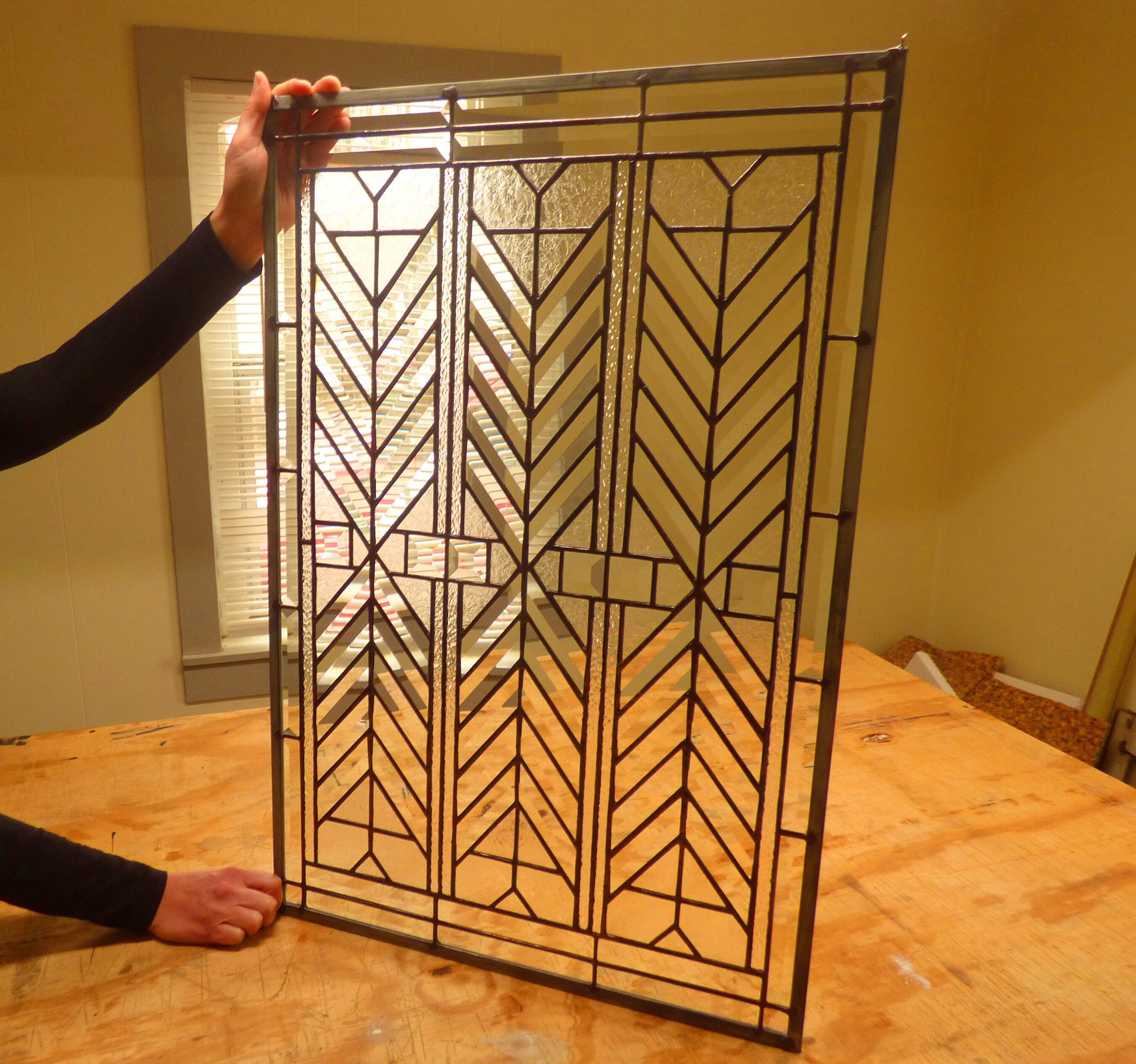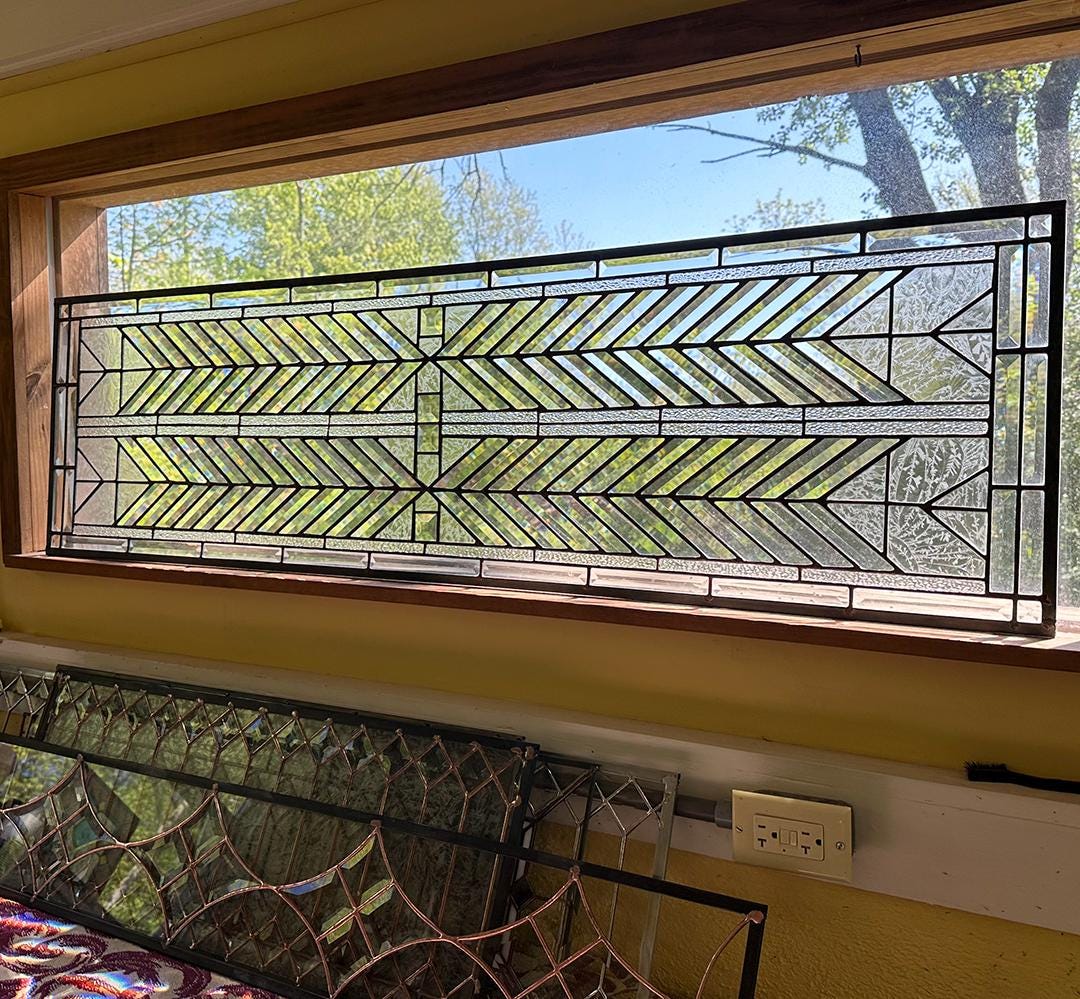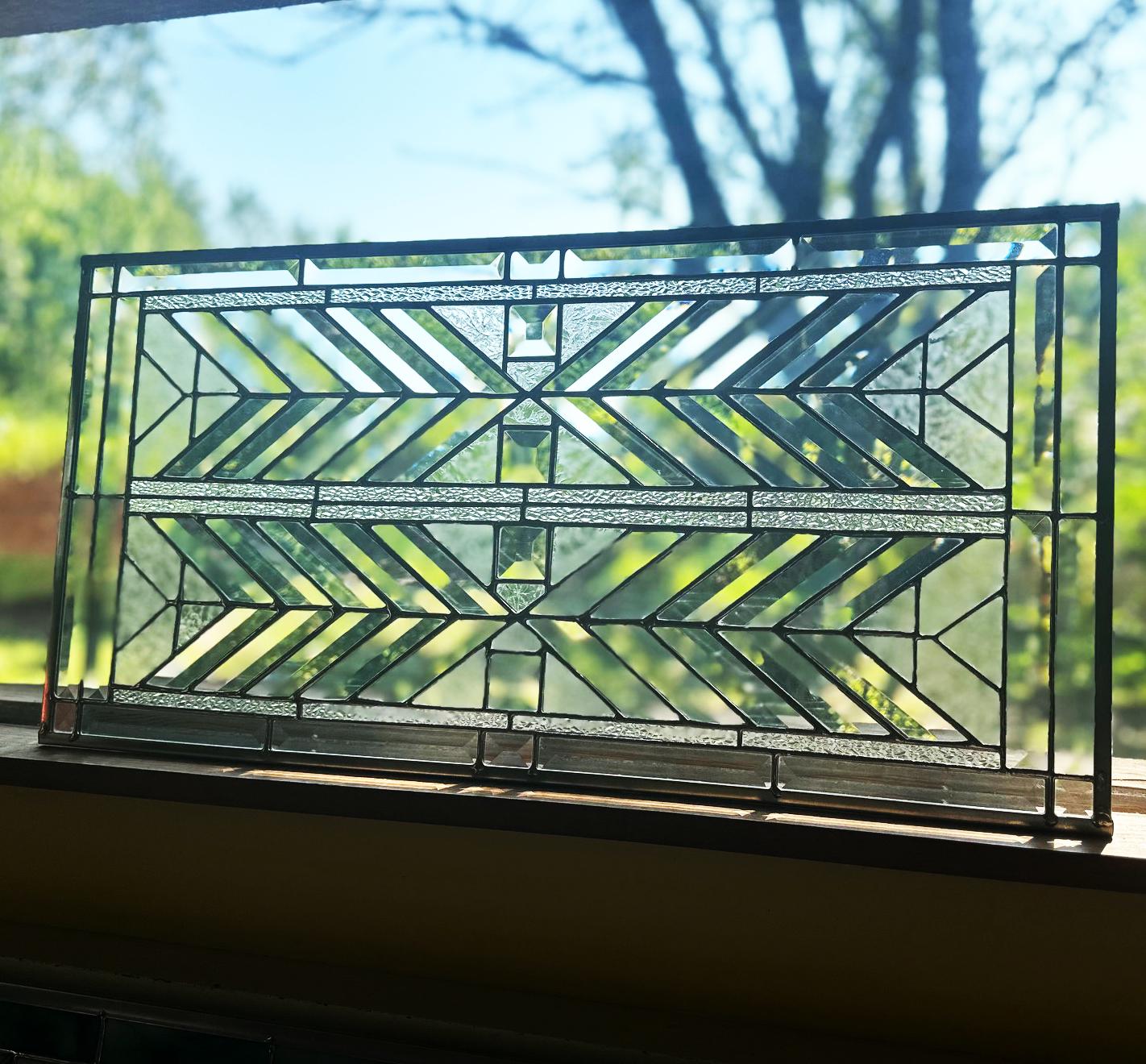 WE MAKE CUTOM SIZES! This beautiful FLW stained glass transom or sidelight is made with clear square bevels, rectangle bevels, a nice contrasting heavy texture with a clear slightly wavey water glass. All I need is the final size. This could make some incredible window art / suncatcher with an addition of hooks.