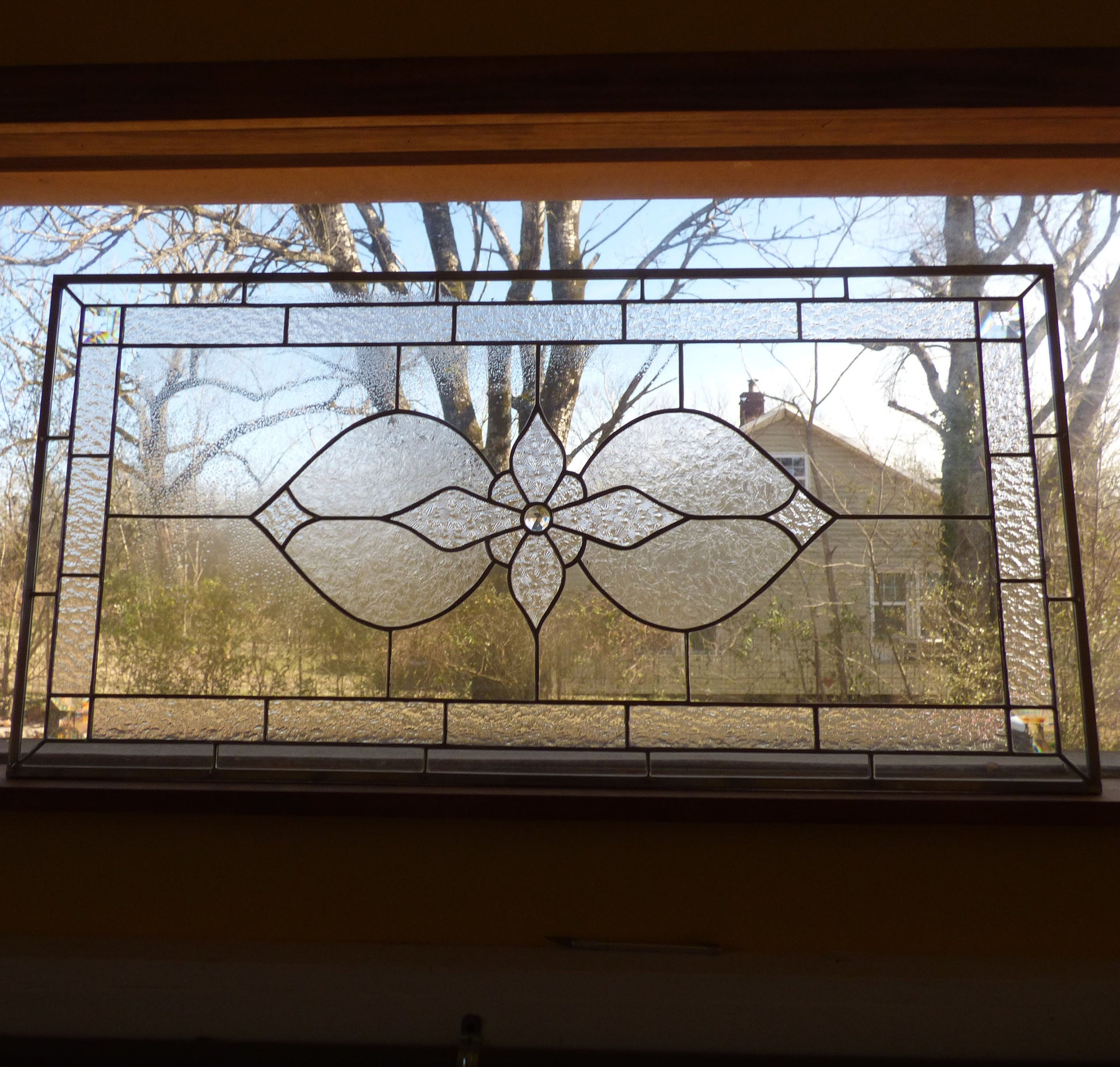 WE MAKE CUSTOM SIZES! An intricate Florentine Style stained glass Transom or Window is inlaid with clear glass and contrasting clear textures. Measures 36"x18". If you wish to hang instead of installing, I can add hooks.