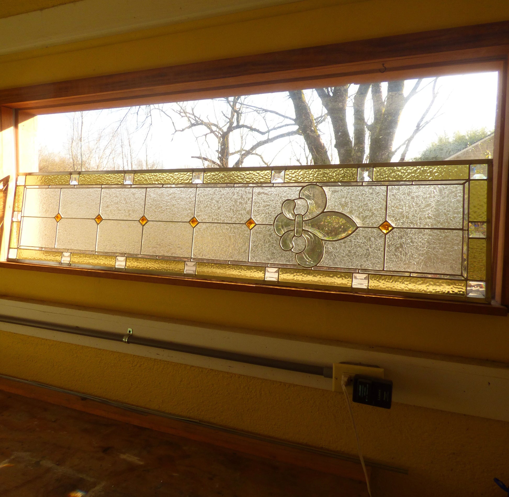 WE MAKE CUSTOM SIZES! Fleur de lis Stained Glass Sidelight. Add a classic to brighten up your front door entrance, add privacy or just a touch of pretty. This is a beautiful style sidelight with a mix of amber, olive green and amber gems and flashy bevels. This could make some incredible window art / suncatcher with an addition of hooks.