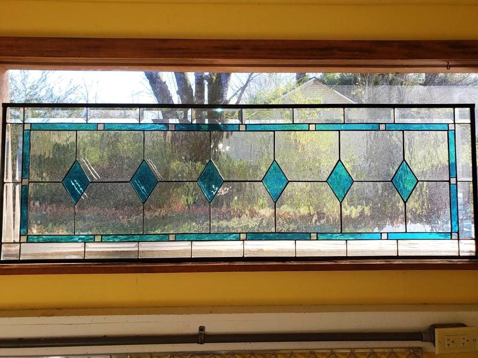WE MAKE CUSTOM SIZES! A contemporary clear with bay blue stained glass sidelight or transom. This piece has a diamond center piece and square bevel surround. Wonderful simplicity and adds privacy if needed. We can add hooks if needed to hang.