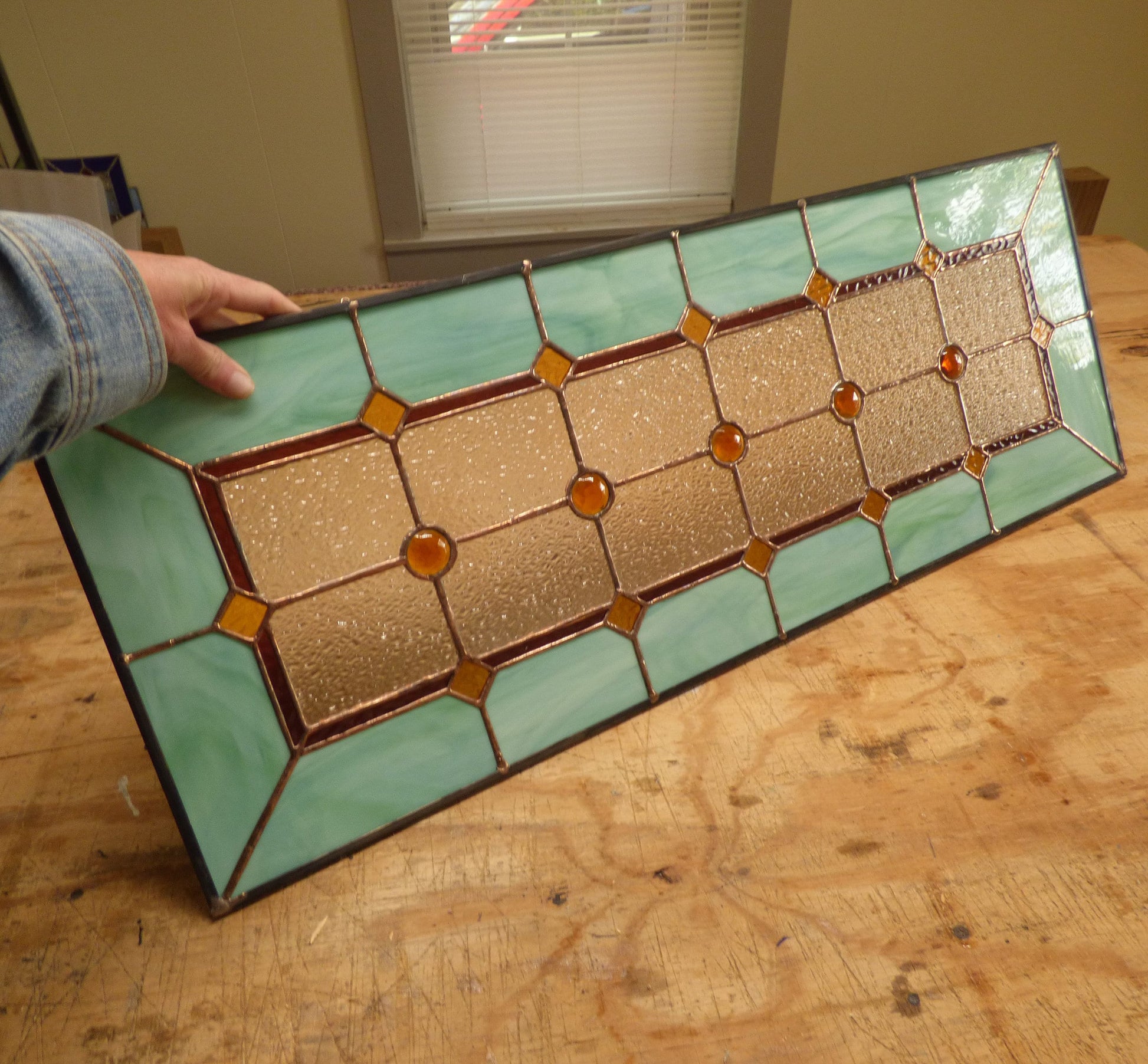 WE MAKE CUSTOM SIZES! Mardi Gras!! Brighten up your front door entrance or add the extra privacy you need with a custom stained glass sidelight or two. This would also make a beautiful transom! This piece has a wonderful seafoam green/blue (not transparent) outer glass with a red inner border, beautiful amber gems/diamonds and a highly textured clear glass made for privacy or you choose the stained glass colors to match your interior or exterior.