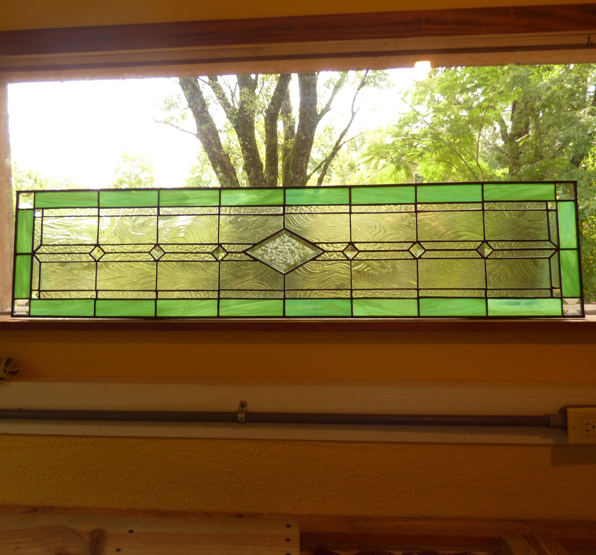 WE MAKE CUSTOM SIZES! This Old Victorian Diamond Transom or Sidelight is made with clear textured stained glass background, diamond bevels with larger focal accent diamond and pretty accent of a green streaky border. Pretty spectacular! Adds privacy if needed. We can add hooks to hang if needed.