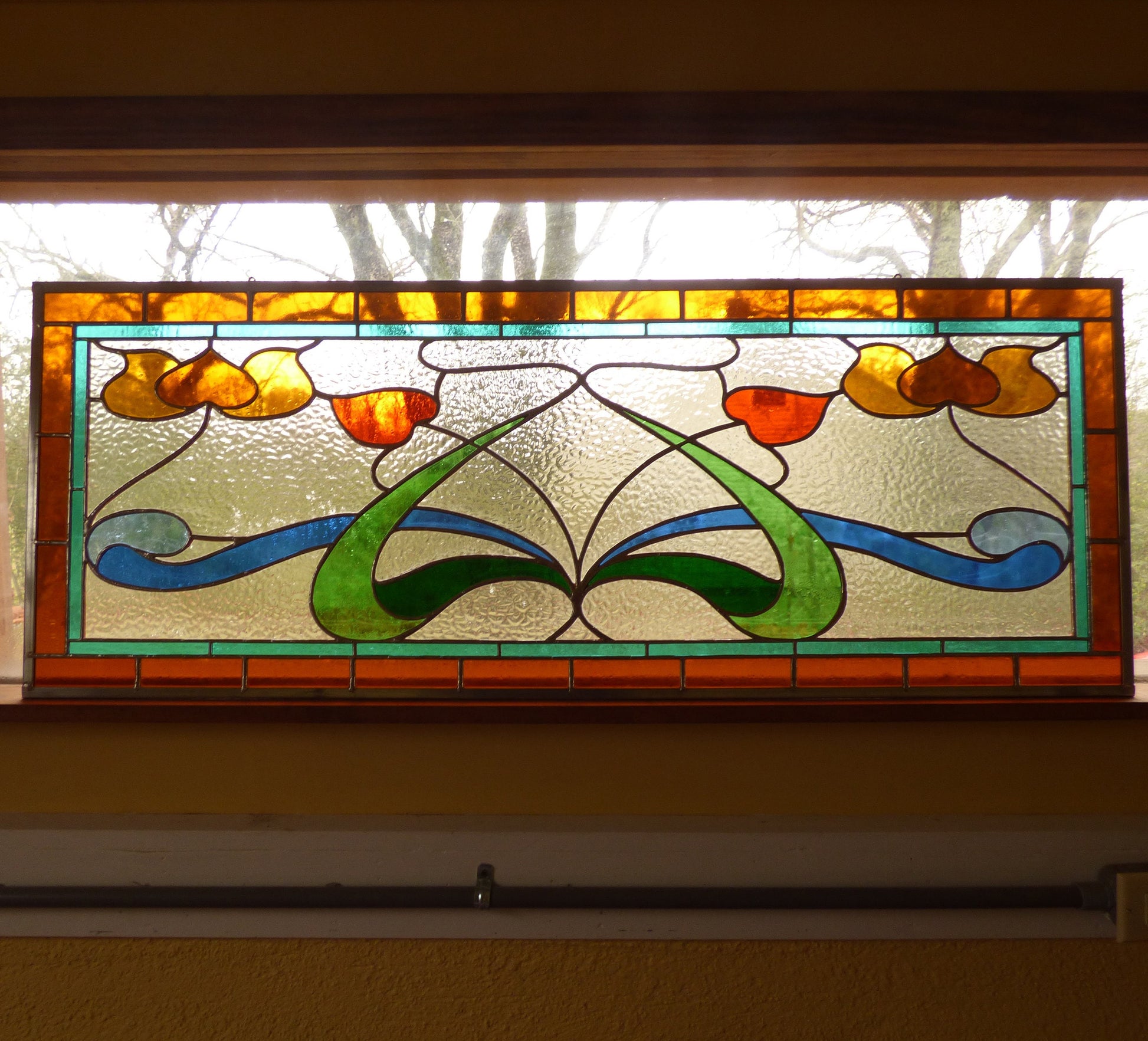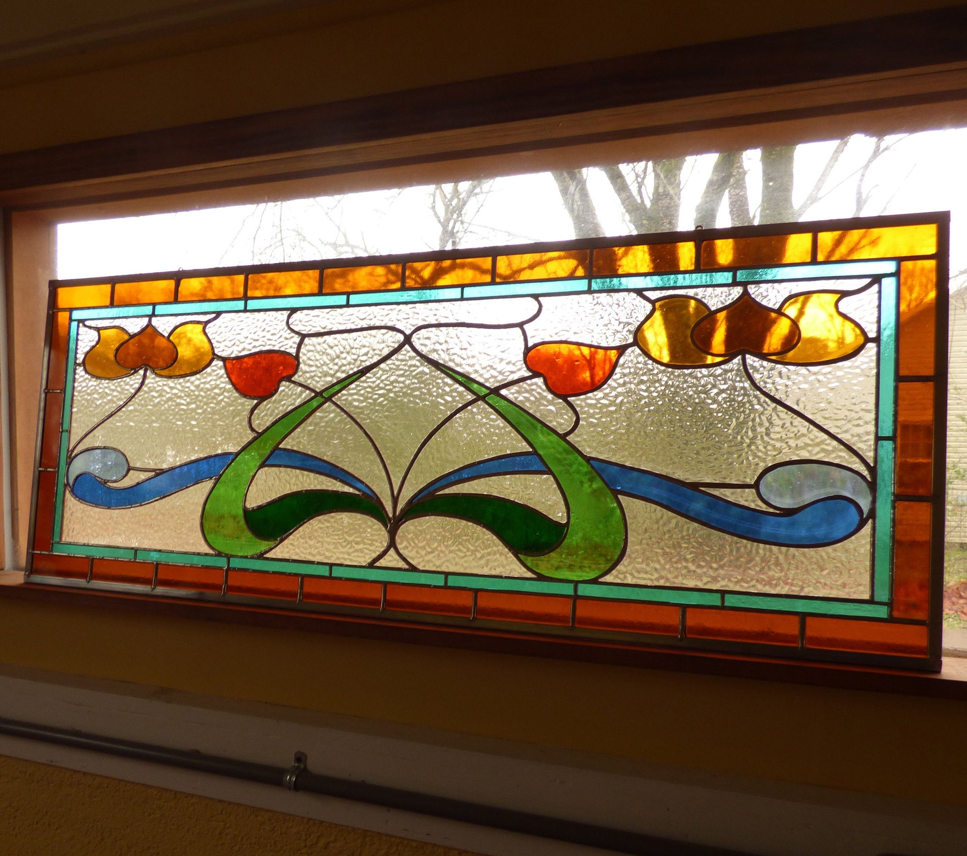 WE MAKE CUSTOM SIZES! This Art Nouveau Transom has a wonderful pop of color combined with a classic texture, sure to be an eye catcher! Feel free to change colors to match your decor. Measuring 47"x18". We can add hooks for hanging.