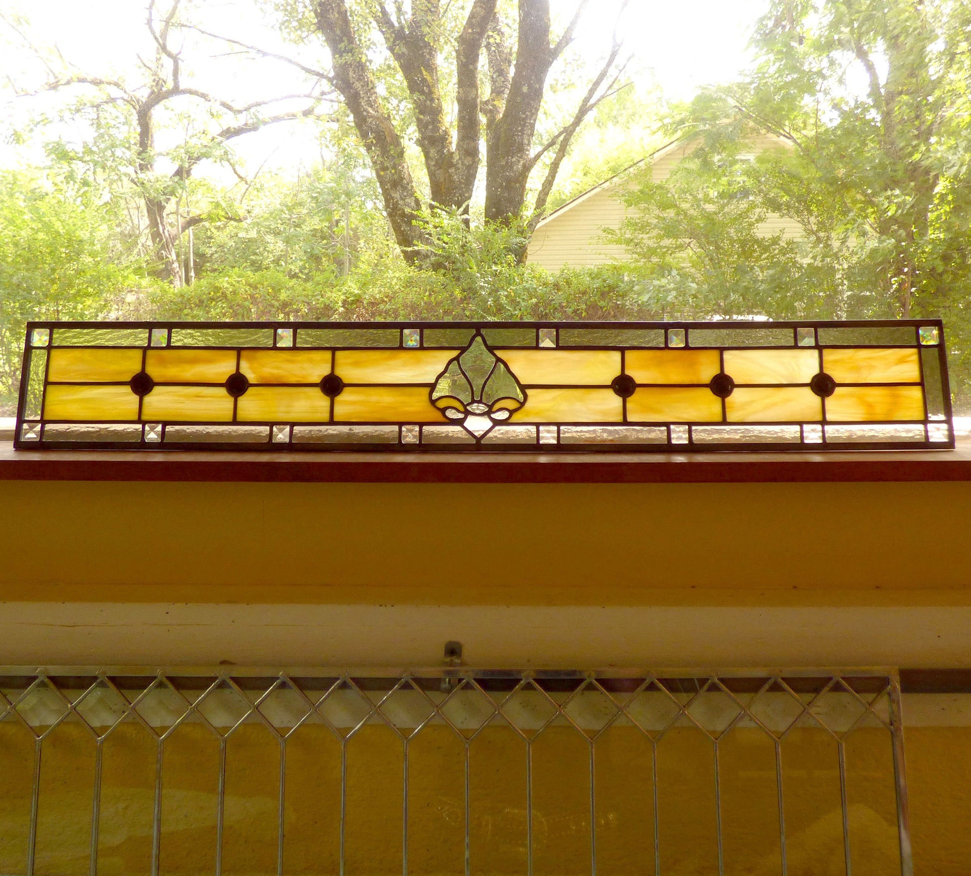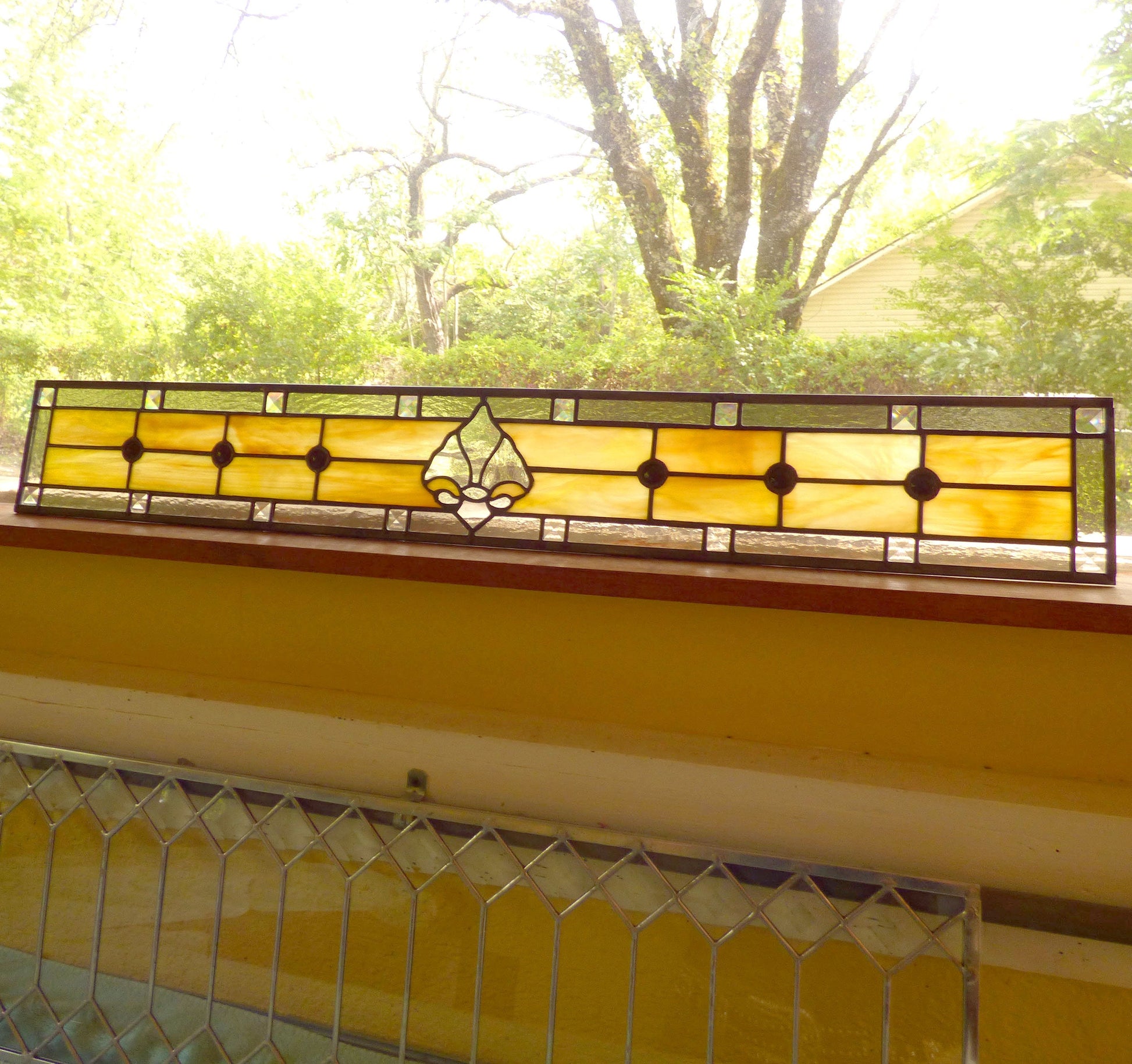 WE MAKE CUSTOM SIZES! Fleur de lis Stained Glass Transom. Add a classic to brighten up your front door entrance, add privacy or just a touch of pretty. This is a beautiful style transom with a mix of amber, and black jewels and flashy bevels. This could make some incredible window art / suncatcher with an addition of hooks.