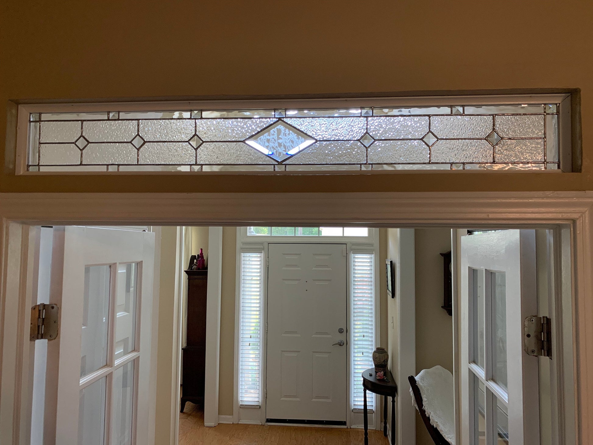 WE MAKE CUSTOM SIZESThis beautiful diamond transom / sidelight is made with clear textured stained glass, diamond bevels with a square bevel surround. Pretty spectacular!. Wonderful simplicity and adds privacy if needed. Add hooks for hanging if you do not want to install.