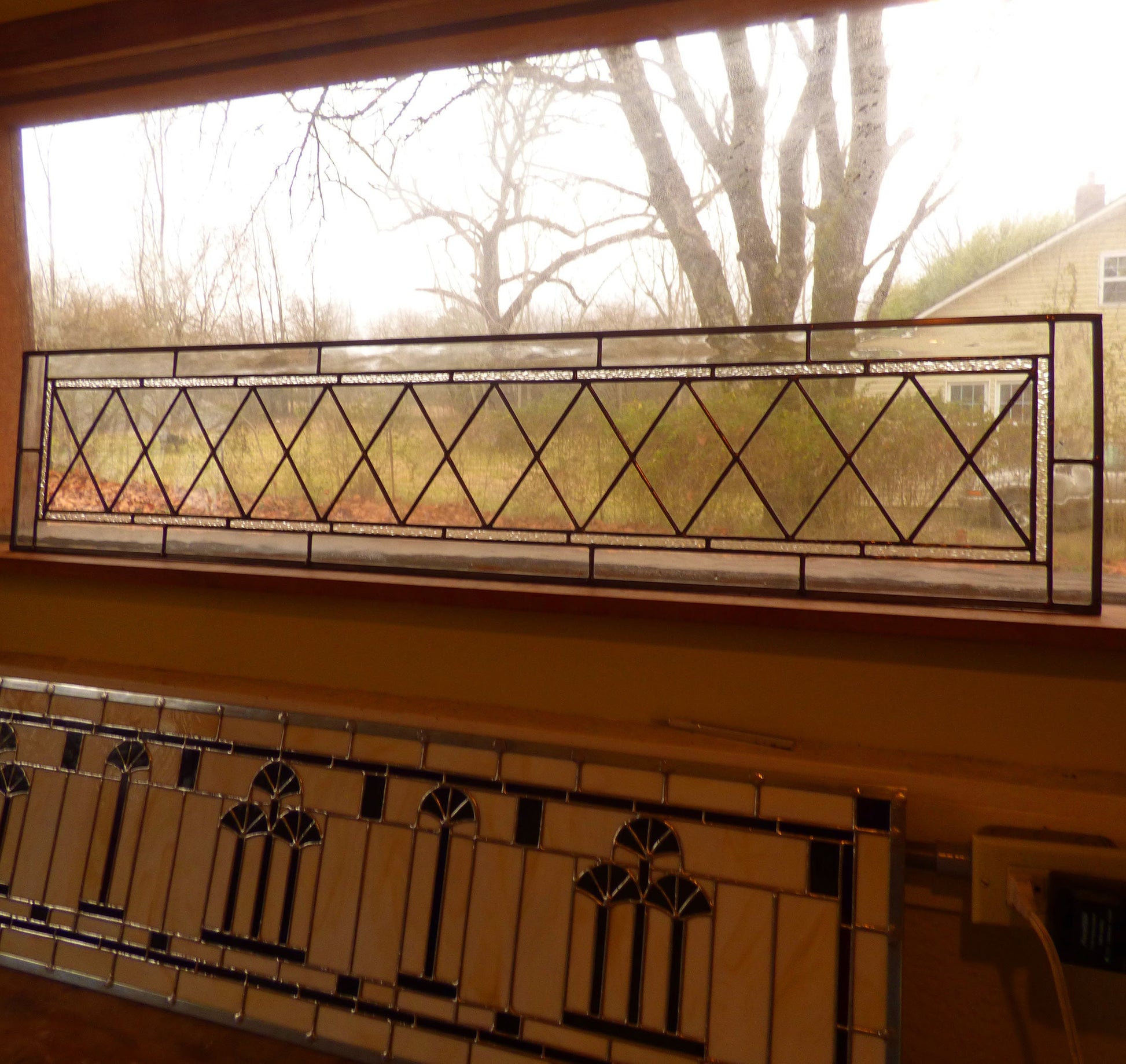 WE MAKE CUSTOM SIZES! This old world stained glass transom or sidelight with clear diamonds and a touch of textured clear. Brighten up your front door entrance or add privacy. Price is based on 8x36" size. Hooks can be added for a beautiful suncatcher.