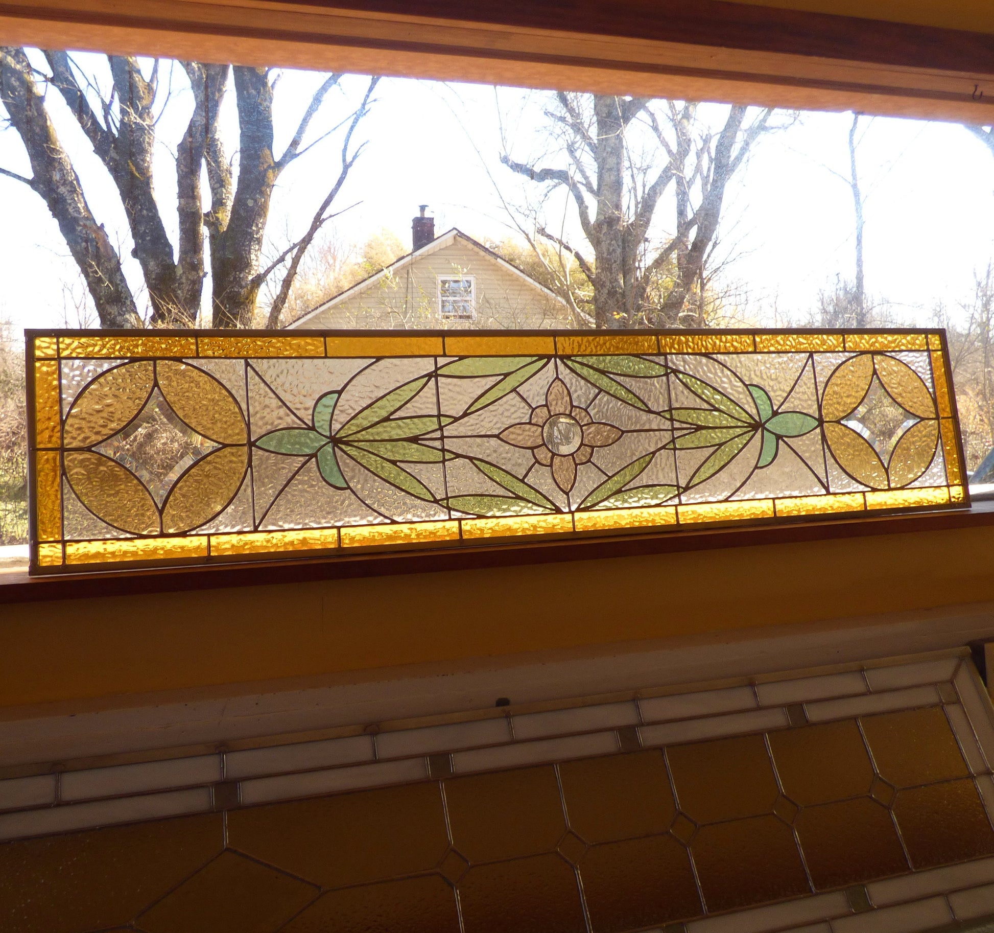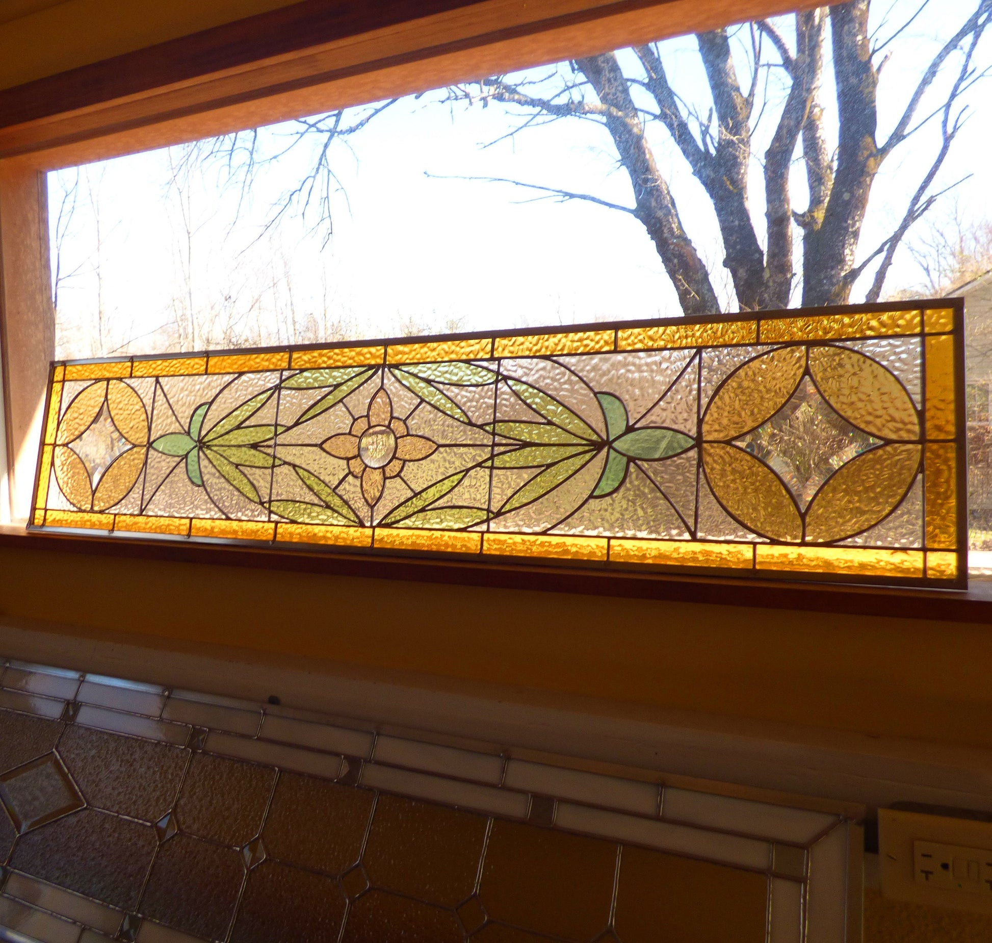 Country Farm House Stained Glass Transom or Sidelight. An intricate design using pastel English Muffle Glass and a few bevels. Measures 10x46. Add a classic to brighten up your front door transom or sidelights, add privacy or just a touch of pretty. This is a beautiful Victorian style transom.