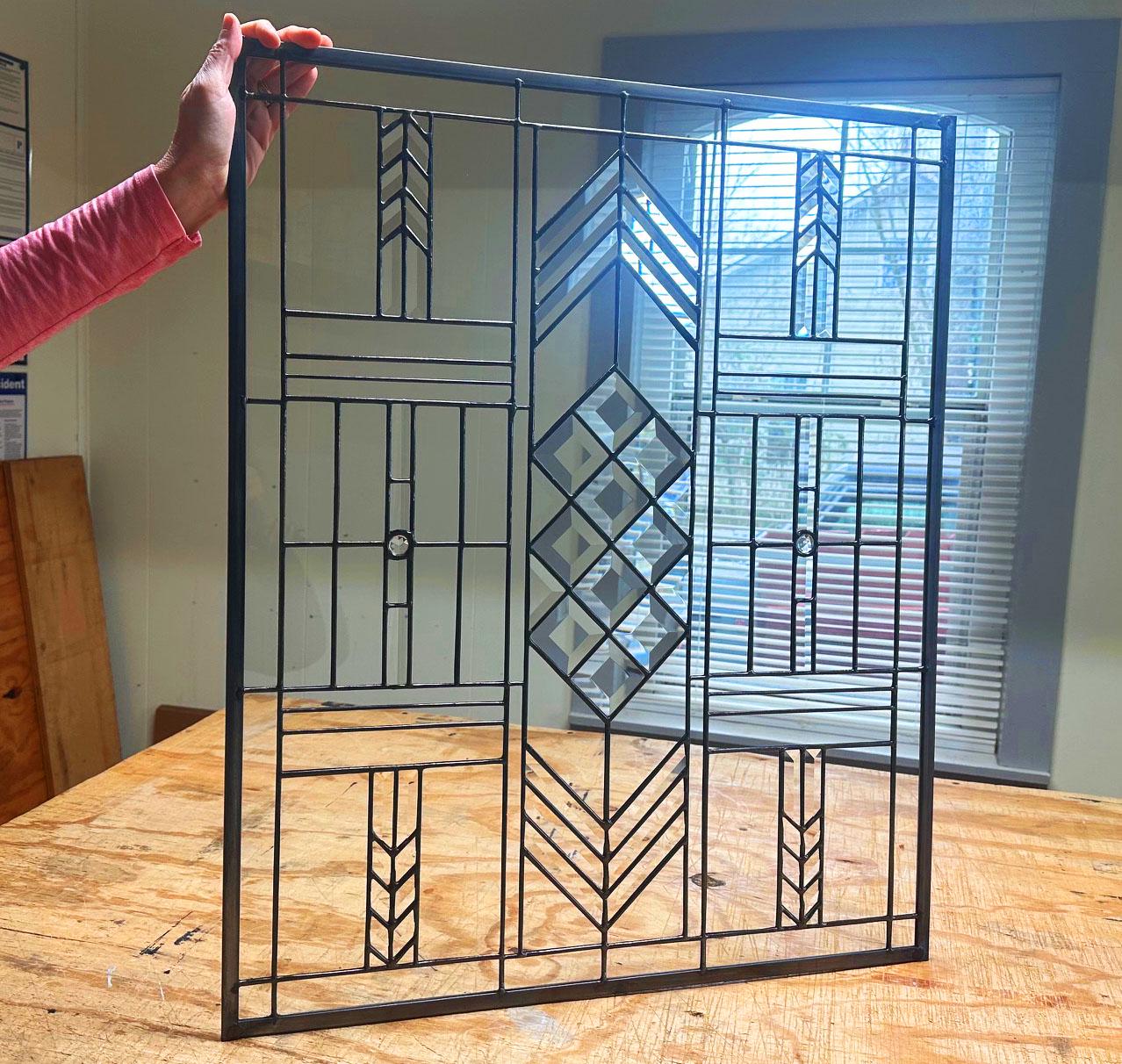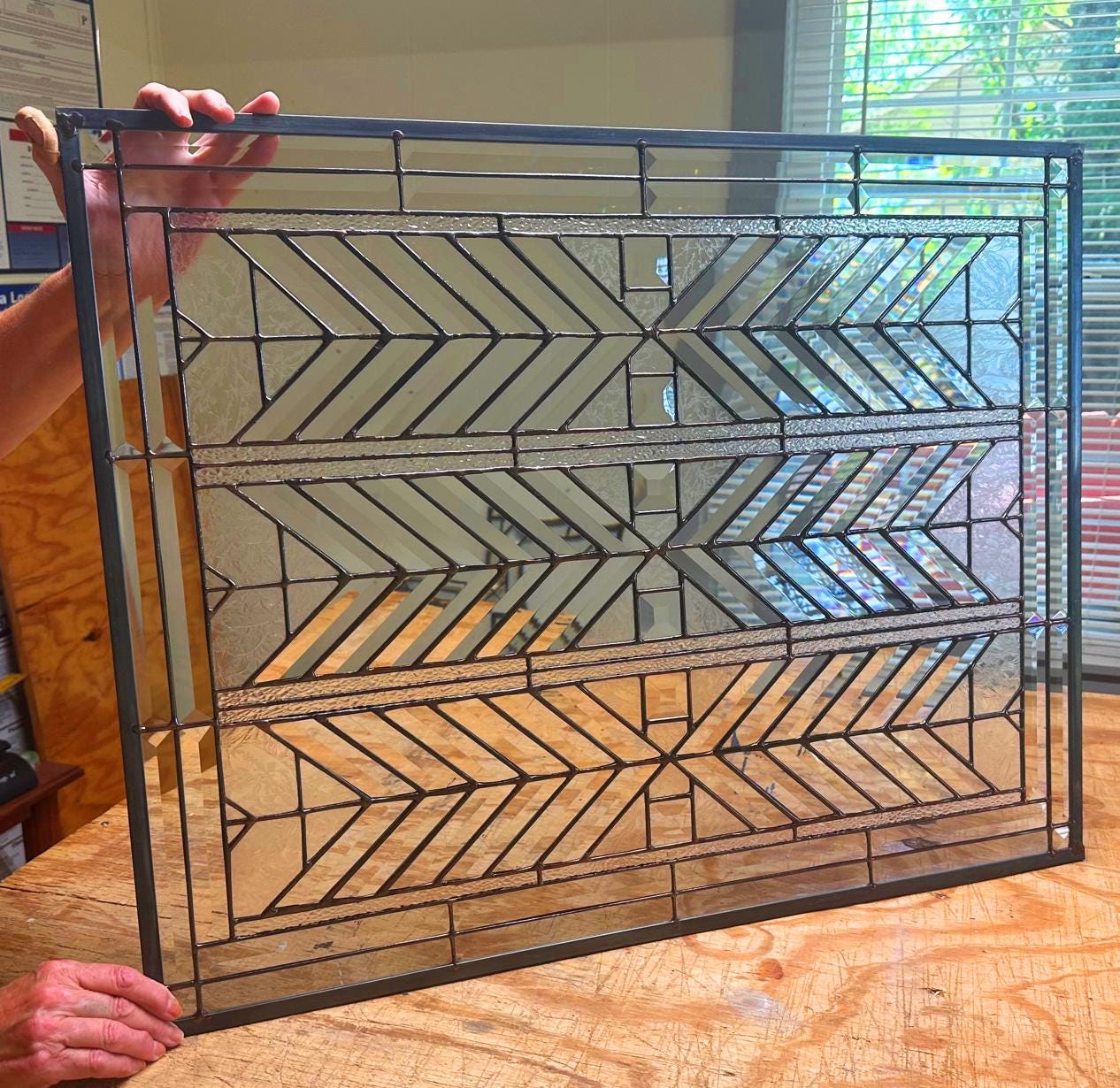This beautiful FLW window is made with clear square bevels, rectangle bevels, a nice contrasting heavy texture with a clear slight wave glass. All I need is the final size. This could make some incredible window art / suncatcher with an addition of hooks.