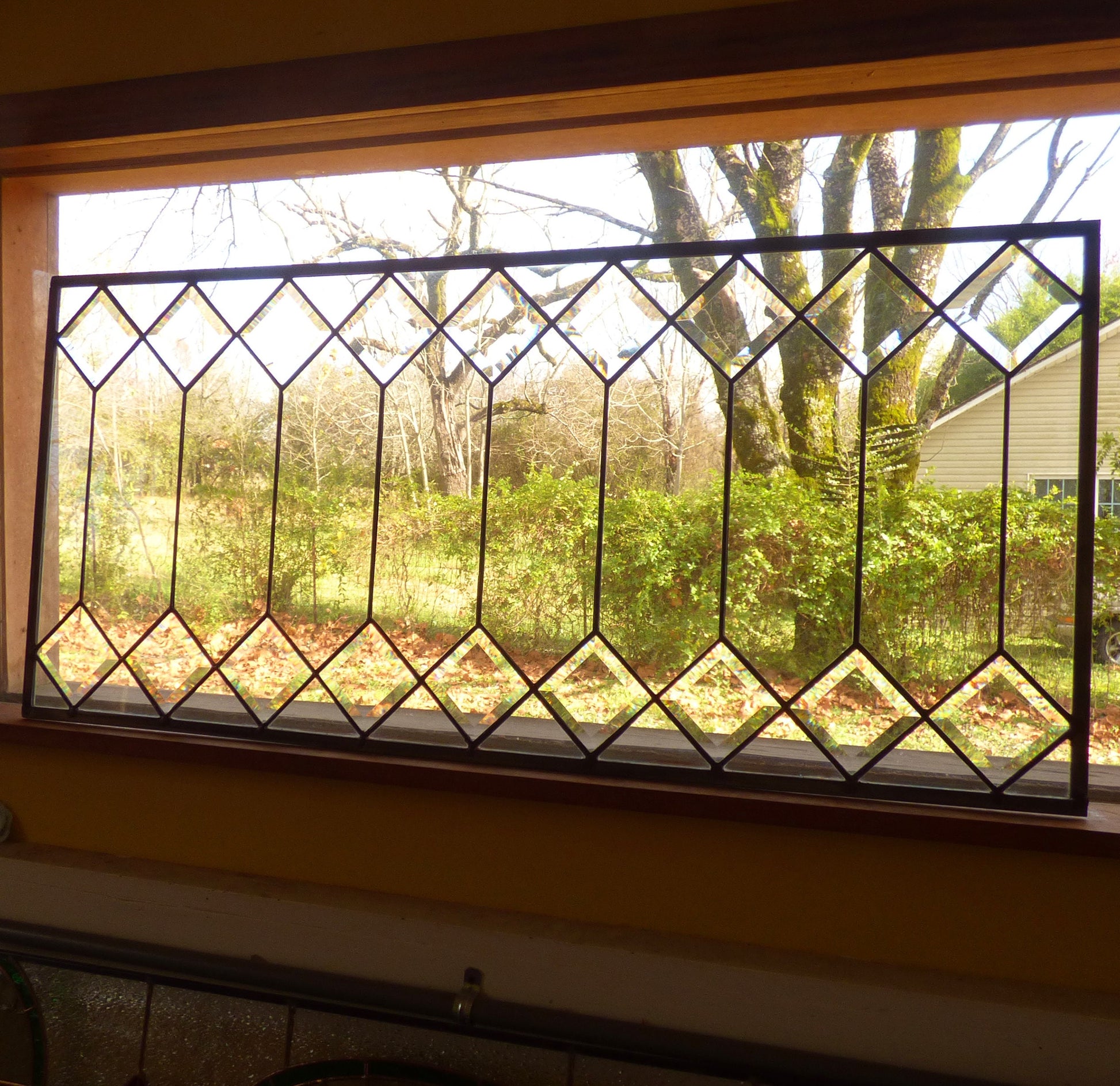 WE MAKE CUSTOM SIZES! This beautiful Trellis transom is made with 3" bevels and clear glass. This panel works well with a transom that measure 14" or more in height. Convo me your final size for quote. we can add hooks for hanging.
