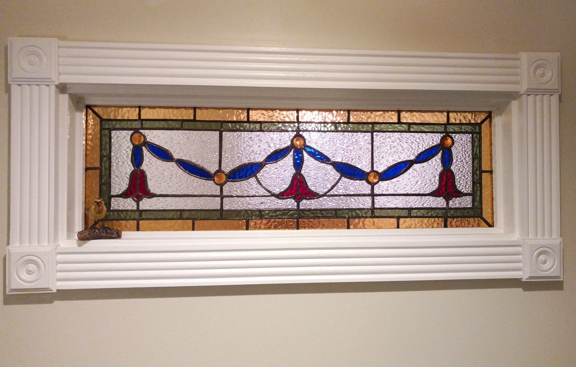 Victorian Ribbon Stained Glass Transom. Add a classic to brighten up your front door entrance, add privacy or just a touch of pretty. This is a beautiful Victorian style transom with a mix of amber, cobalt blue, ruby red and amber gems. We can add hooks if you need the panel to hang.