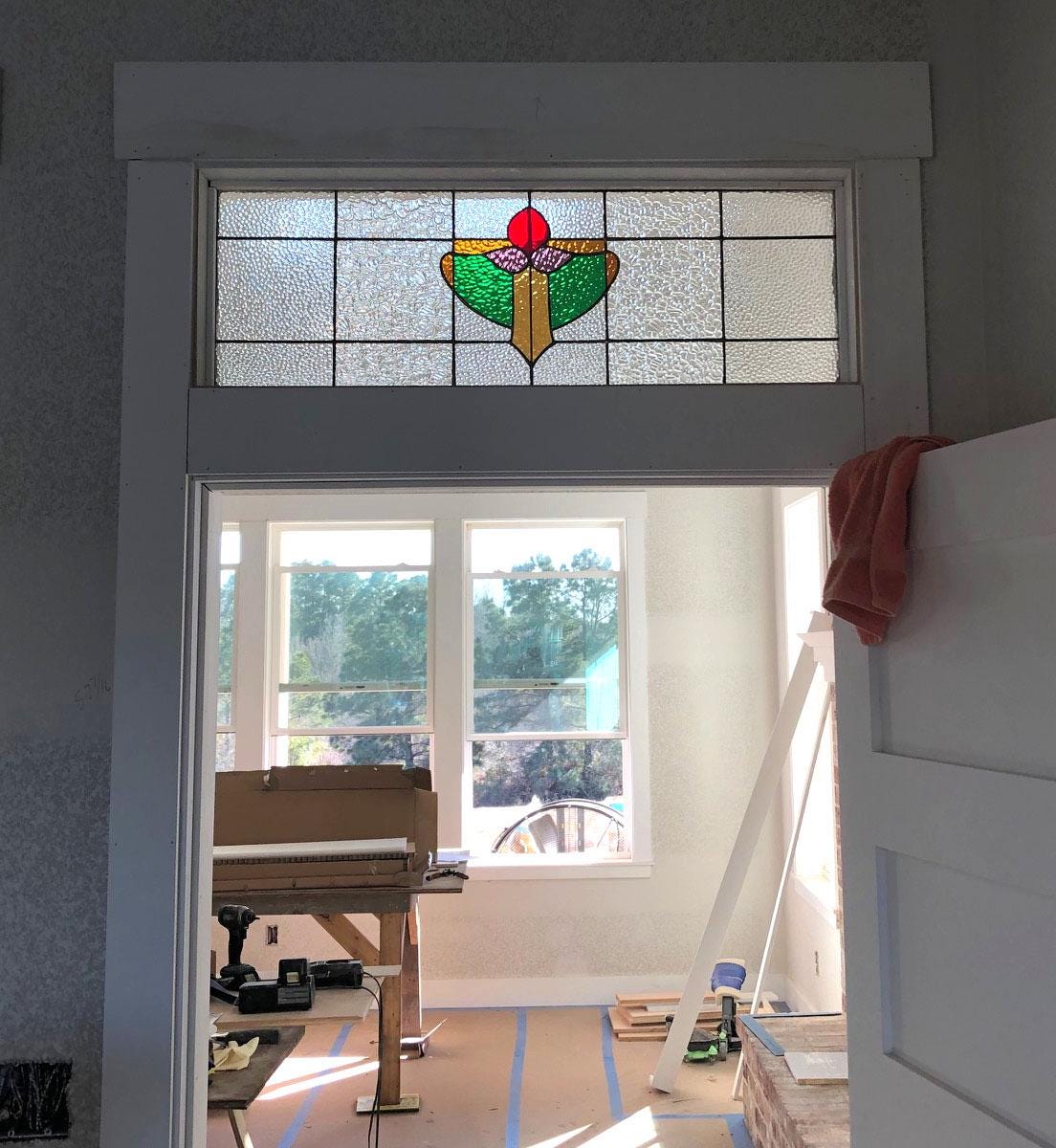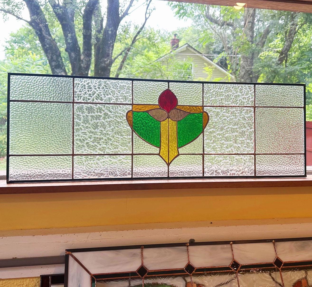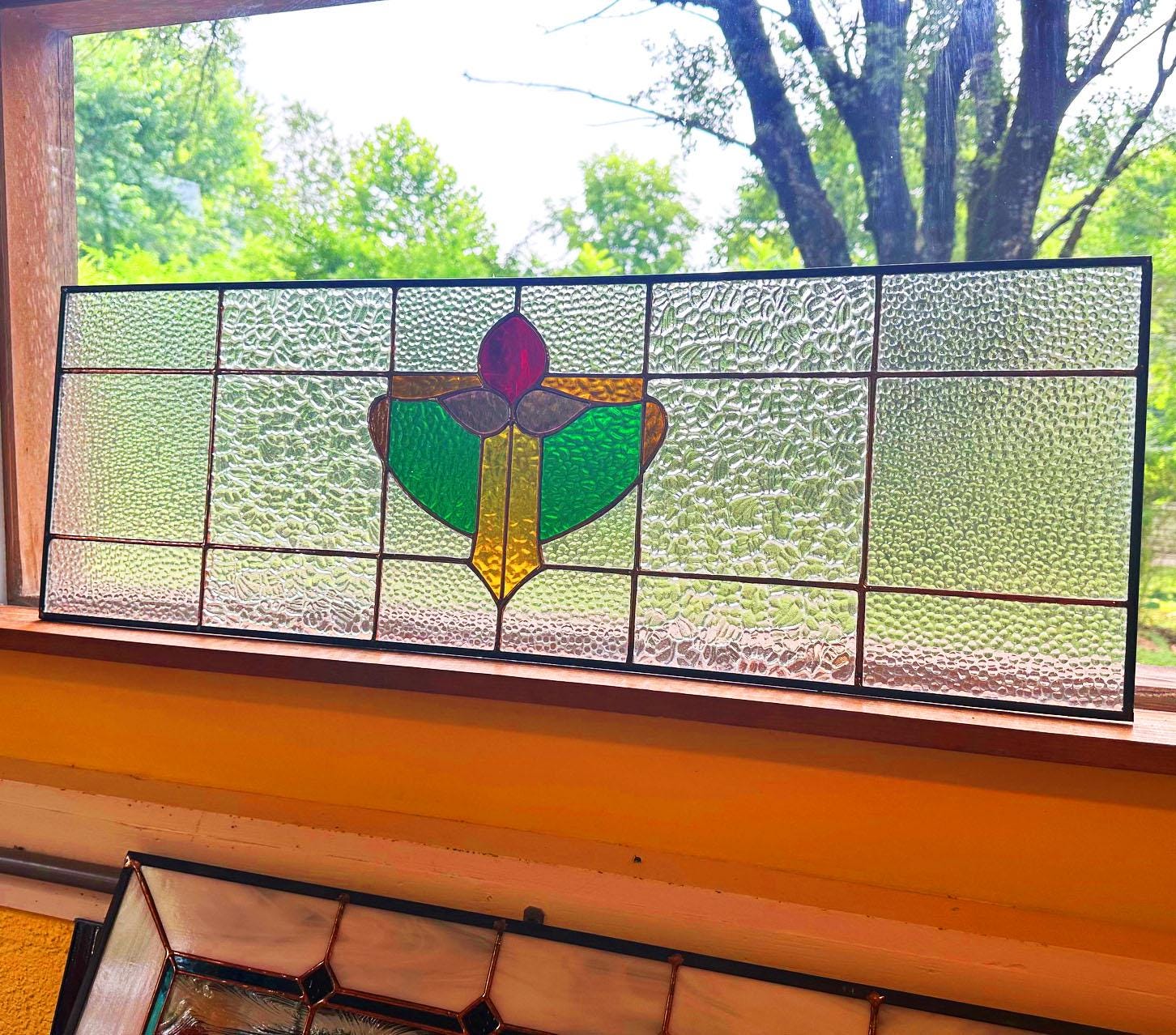 WE MAKE CUSTOM SIZES! A replicated Vintage Angel Stained Glass Transom made with 2 different heavily textured clear glass, ambers, dark green, red and lavender. Measures 12x36. Ready to install or let me know if you need hooks to hang.